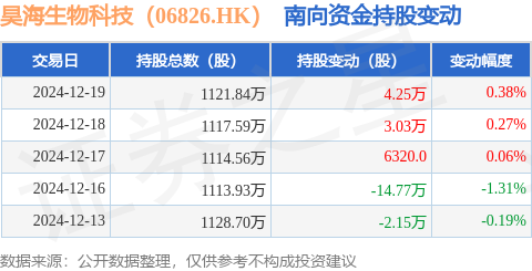 本站消息,12月19日南向资金增持4.25万股昊海生物科技(06826.HK)。近5个交易日中,获南向资金减持的有2天,累计净减持9.01万股。近20个交易日中,获南向资金增持的有11天,累计净增持19.67万股。截至目前,南向资金持有昊海生物科技(06826.HK)1121.84万股,占公司已发行普通股的27.94%。